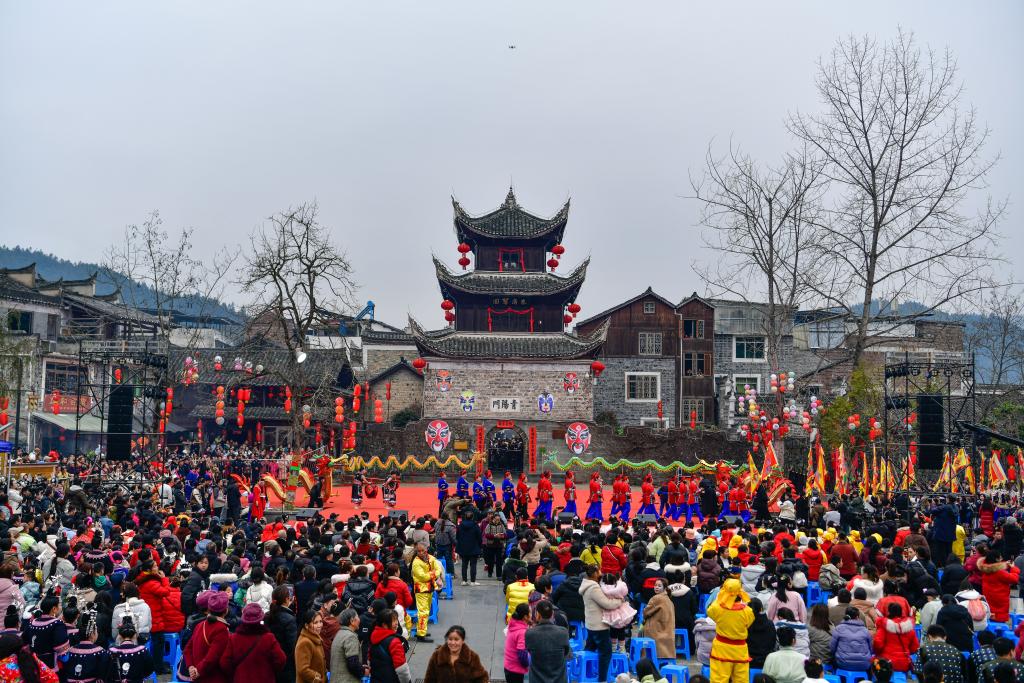这是2月11日拍摄的贵州锦屏隆里“村晚遇元宵·来隆里玩花脸龙”活动现场。新华社记者 杨文斌 摄