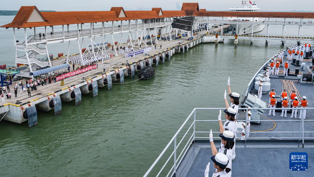 11月29日,在马来西亚巴生港,学员在甲板分区列队,向欢迎人群挥手致意。新华社发(于涛摄)