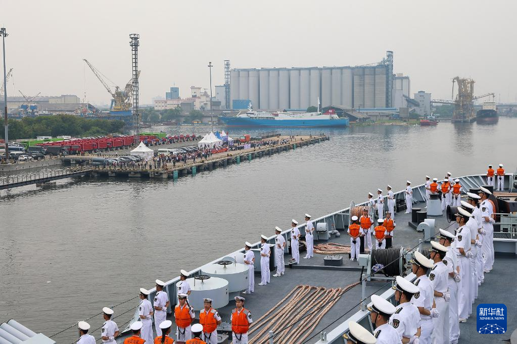 当地时间上午,中国海军989编队舰艇缓缓靠泊丹戎不碌港码头,来自海军工程大学和海军航空大学的学员在甲板分区列队,向前来迎接的人群挥手致意。中国驻东盟使团工作人员、中国驻印度尼西亚大使馆工作人员、留学生代表、当地华侨华人代表、印度尼西亚海军官兵代表等400余人到码头迎接。