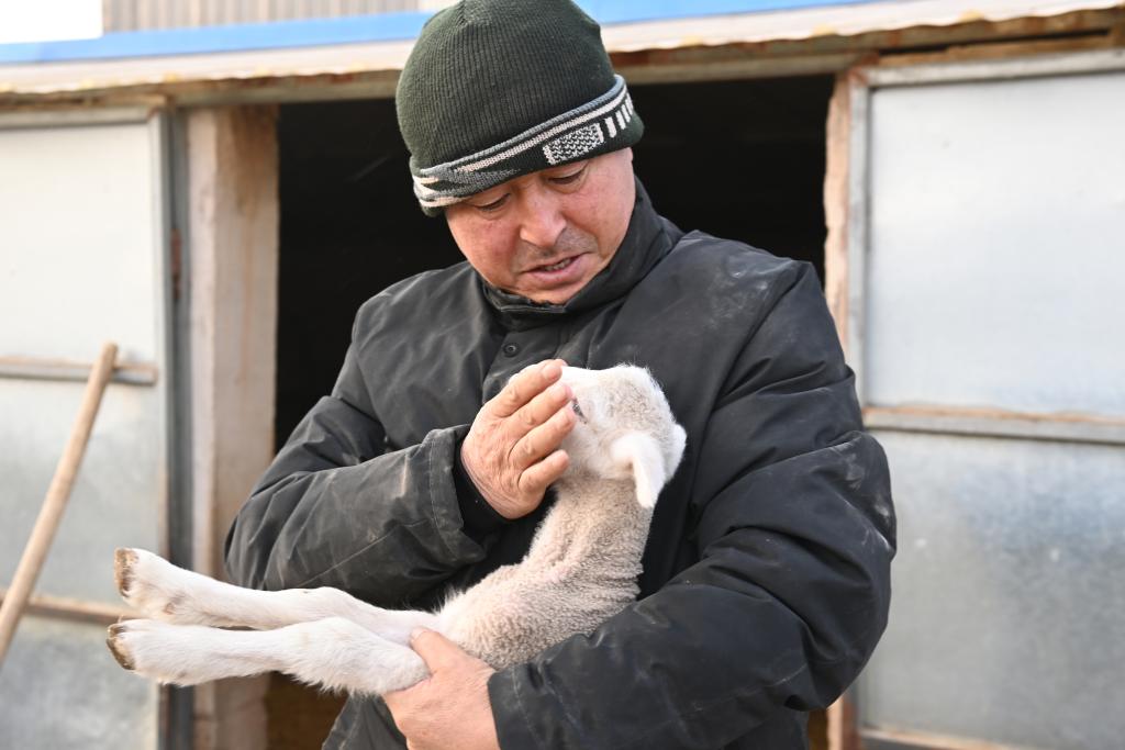 1月21日,在天祝县松山镇达隆村,杨文查看羊羔长势情况。新华社记者范培珅 摄