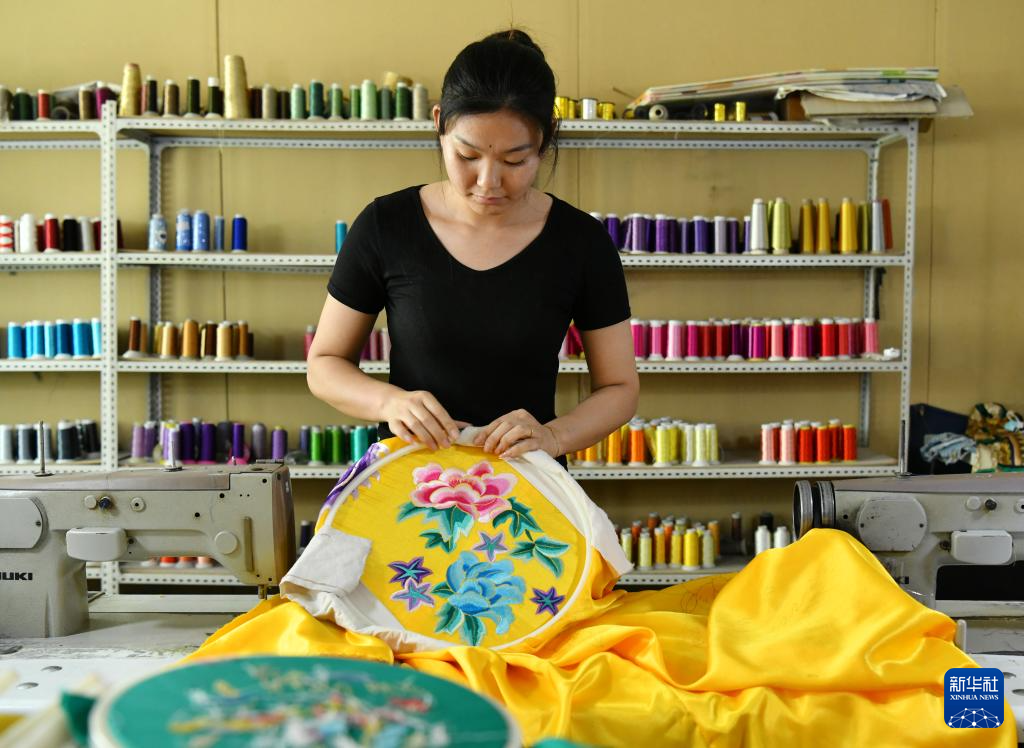 6月13日,河北省肃宁县邵庄乡东高家口村一家戏曲服装厂的工人在绣制戏曲服装。