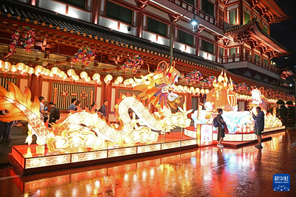 1月19日,游客在新加坡牛车水农历新年灯饰前拍照留影。新华社发(邓智炜 摄)