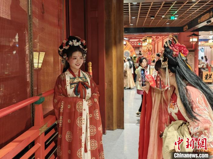 图为游客身着汉服在长安十二时辰主题街区内拍照。 党田野 摄