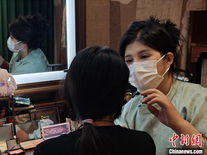 图为西安汉服妆造师曹子贤(右)为游客化妆。 党田野 摄