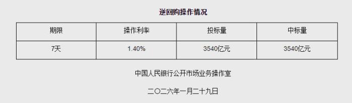 据央行网站消息,2026年1月29日中国人民银行以固定利率、数量招标方式开展了3540亿元7天期逆回购操作。具体情况如下: