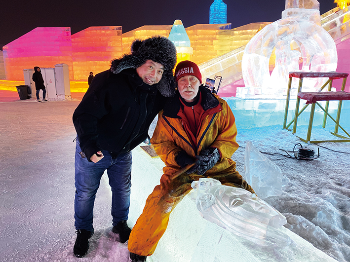 孙海波同参加国际冰雕比赛的俄罗斯冰雕艺术家交流冰雕技艺