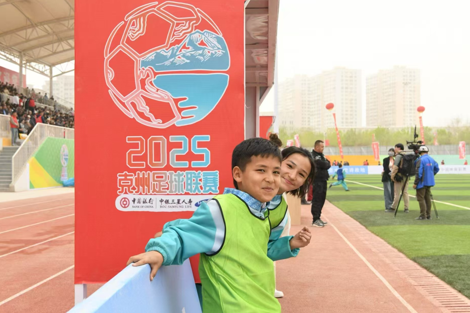 中国银行·中银三星人寿“石榴籽杯”2025年克州足球联赛开幕,青少年组球员在场边等待。