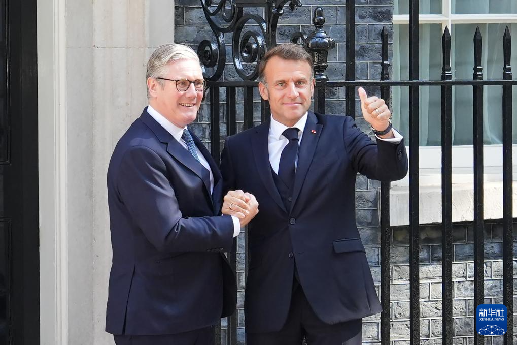 7月10日,在英国伦敦唐宁街10号首相府前,英国首相斯塔默(左)与法国总统马克龙握手。
