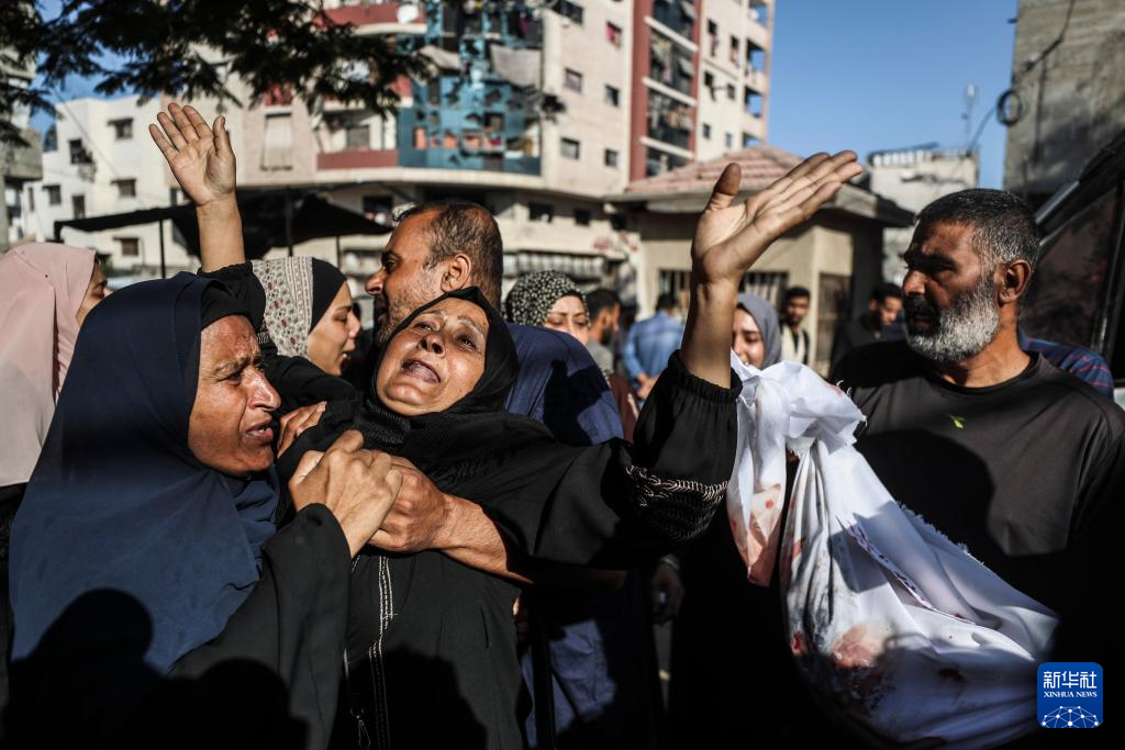 7月8日,巴勒斯坦人聚集在加沙城的希法医院外,哀悼在以色列空袭中死难的亲友。
