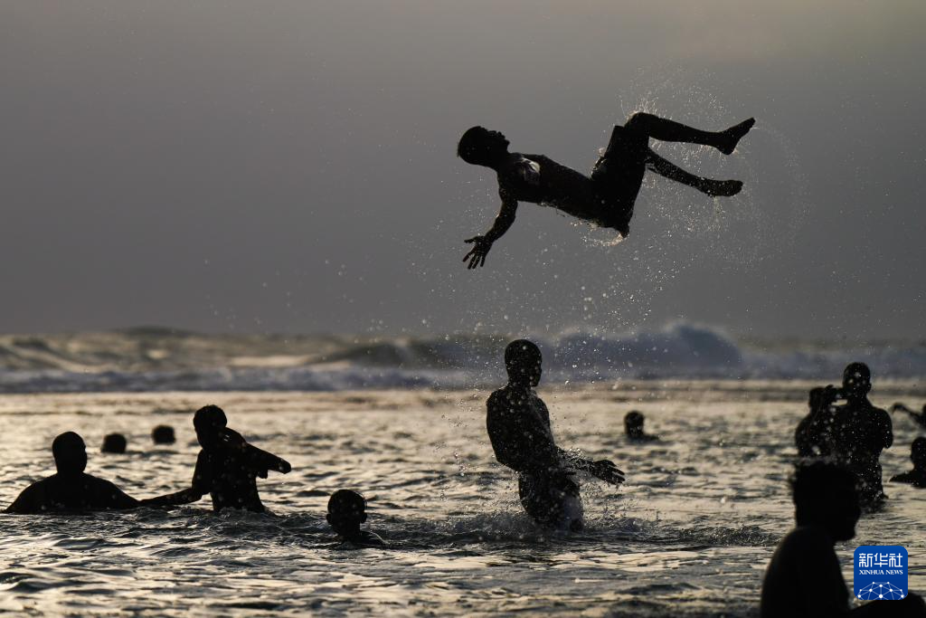 7月9日,人们在斯里兰卡加勒海边戏水休闲。