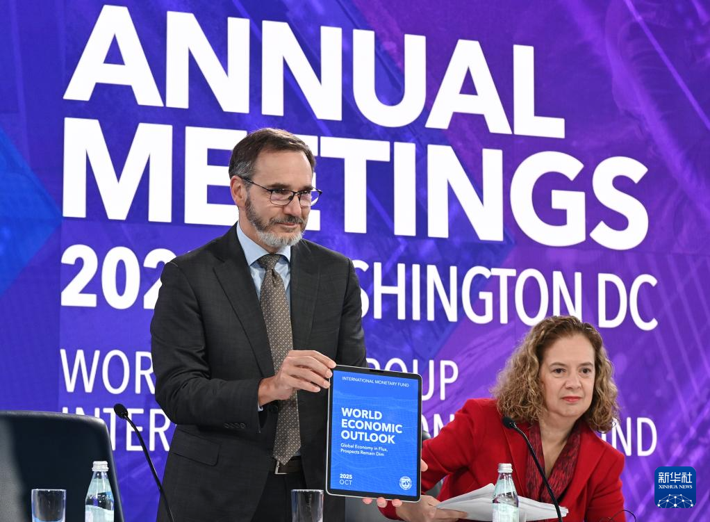 10月14日,在美国华盛顿,国际货币基金组织首席经济学家皮埃尔-奥利维耶·古兰沙(左)在《世界经济展望报告》新闻发布会上展示报告。