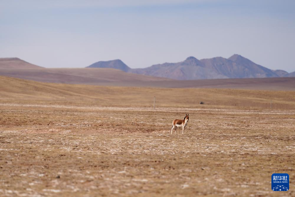 3月10日,在青海省果洛藏族自治州玛多县境内的黄河源地区,一只藏野驴在觅食。