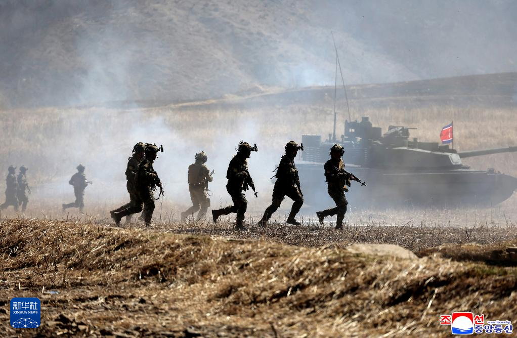 这是朝中社提供的朝鲜步兵和坦克兵部队协同演习的现场图片。