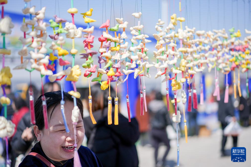 3月20日,游客在呼和浩特黄河开河民俗文化周开幕式现场观看当地面塑展示。