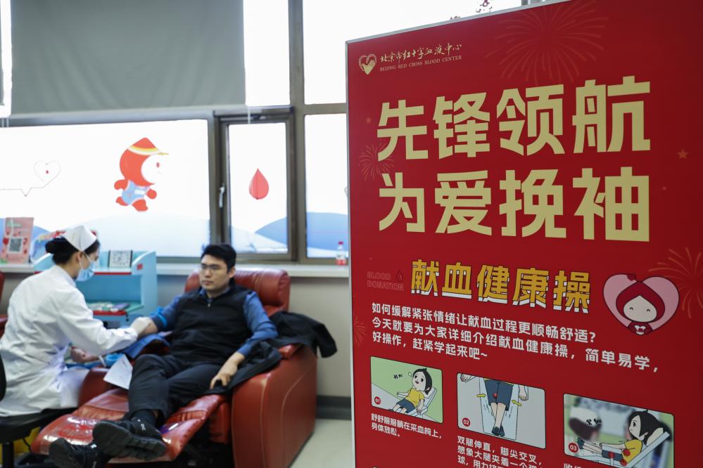 3月20日,献血者在北京市红十字血液中心参与团体献血活动。