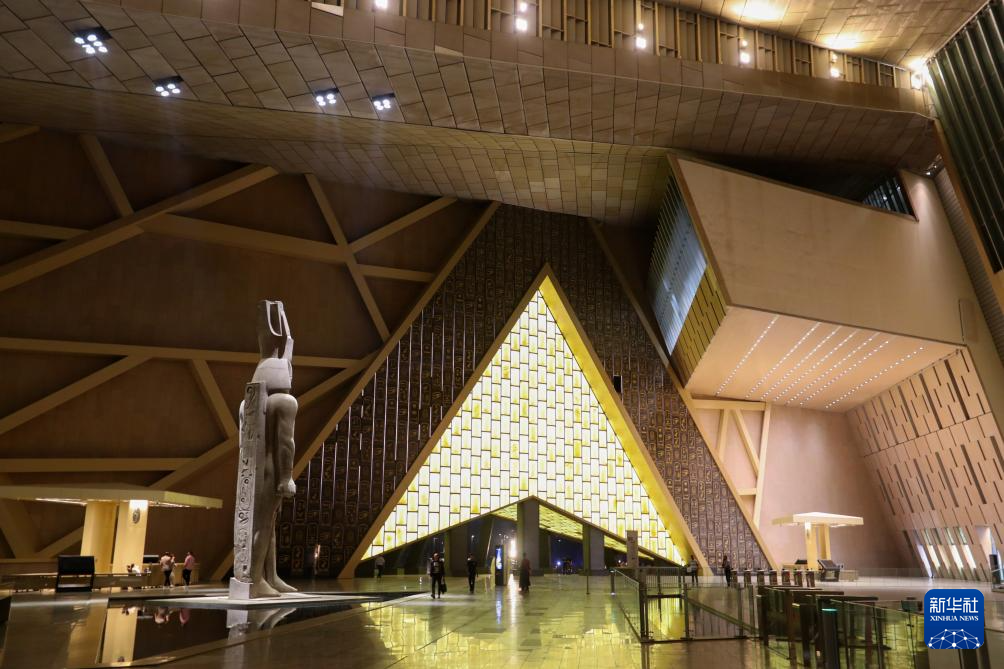 这是10月8日在埃及吉萨省拍摄的晚上亮灯的大埃及博物馆大厅。