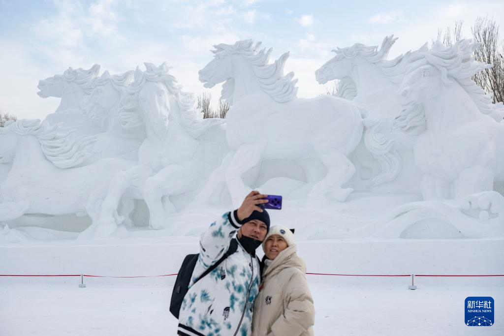1月13日,在哈尔滨太阳岛雪博会园区,游客在大型雪雕《八骏踏雪》旁拍照。