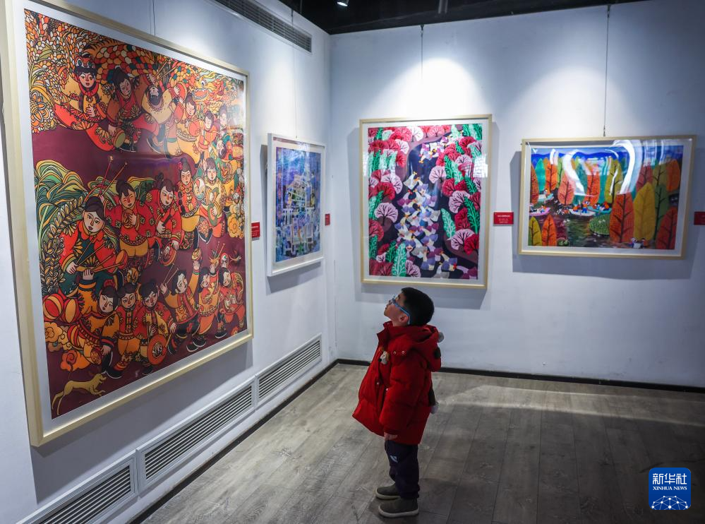 1月23日,一名小朋友在湖州吴兴的小西街西岸美术馆观赏年画美术作品。