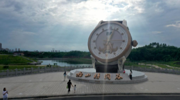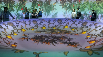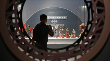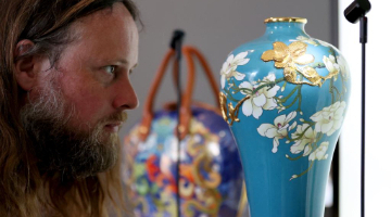 这是展出的清代珐华三彩刻划兽面纹铺首耳琵琶尊(5月19日摄)。