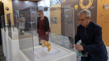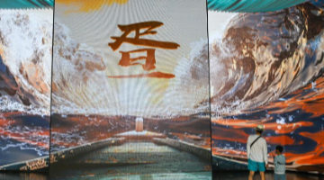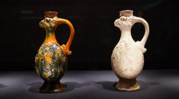5月19日,记者拍摄展出的清代珐华三彩刻划兽面纹铺首耳琵琶尊。