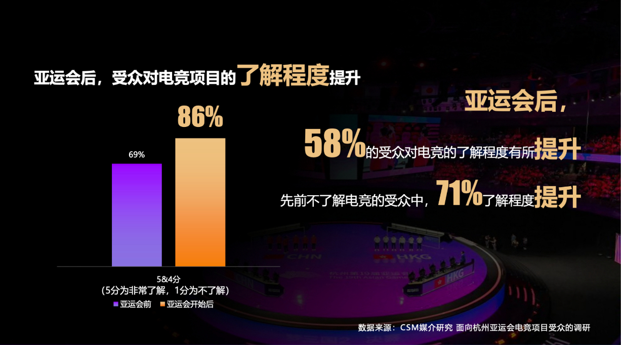 中央广播电视总台国家电子竞技发展研究院数据显示,通过转播亚运会电竞相关赛事及版权分销,央视电竞项目报道在总台自有平台总触达2.02亿人次,各新媒体平台累计观看3.7亿人次。杭州亚运会前对电竞项目不了解的受众中,有71%表示在亚运开始后对电竞项目的了解程度有所提升;在杭州亚运会前对电竞项目略有了解的受众中,有58%表示在杭州亚运会后对电竞项目的了解程度有所提升。