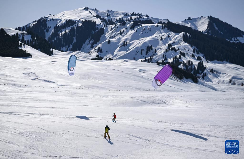 在新疆伊犁河谷东部山区,程鹏和同伴们进行风筝滑雪(3月14日摄)。