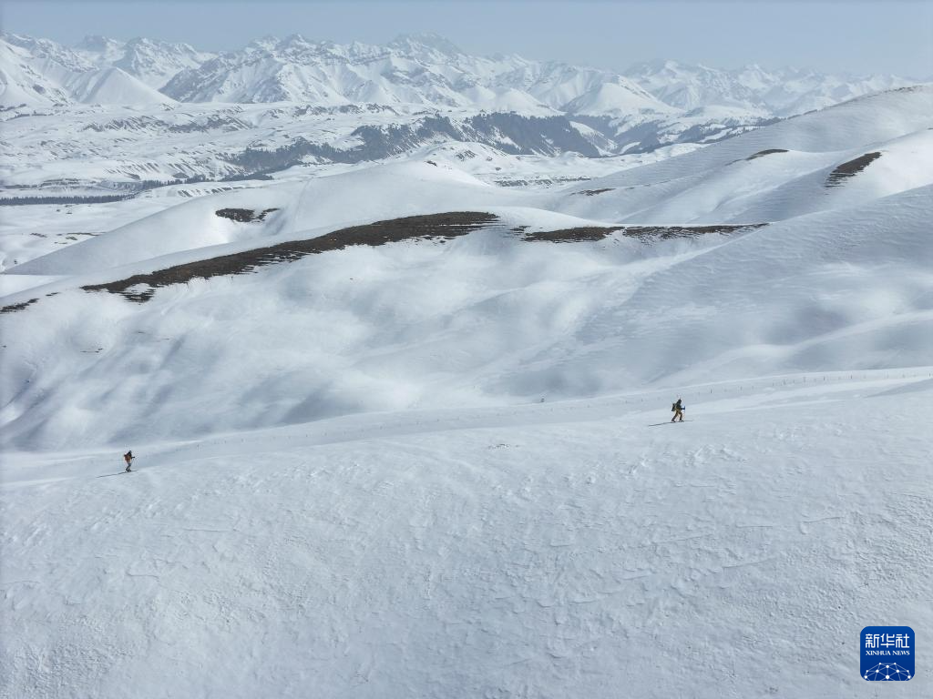在新疆伊犁河谷东部山区,程鹏(右)和同伴为获得理想风力背着装备,踩着滑雪板向更高的山坡行进(3月15日摄,无人机照片)。