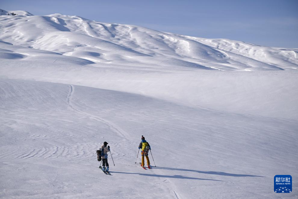 程鹏(左)和同伴一起在新疆伊犁河谷东部山区踏勘风筝滑雪场地(3月14日摄)。