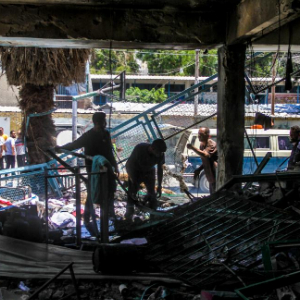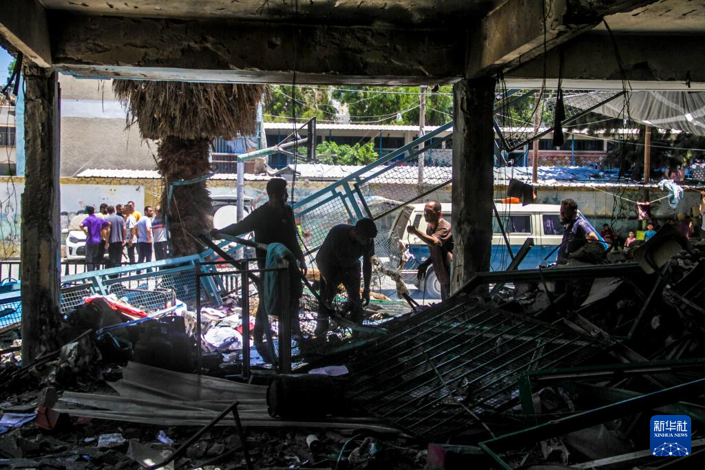 6月25日,巴勒斯坦民众查看加沙城西部沙提难民营一所以军轰炸的学校。