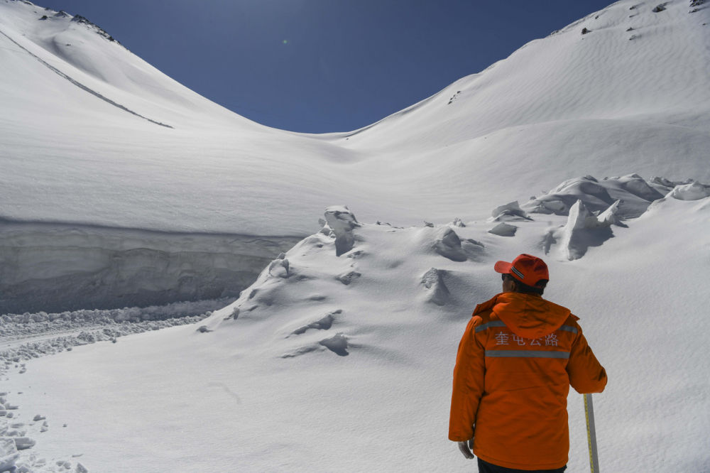 乌兰萨德克养护站工人宋雪岭在海拔约3400米的哈希勒根隧道附近观察山体上积雪崩塌情况(资料照片)。