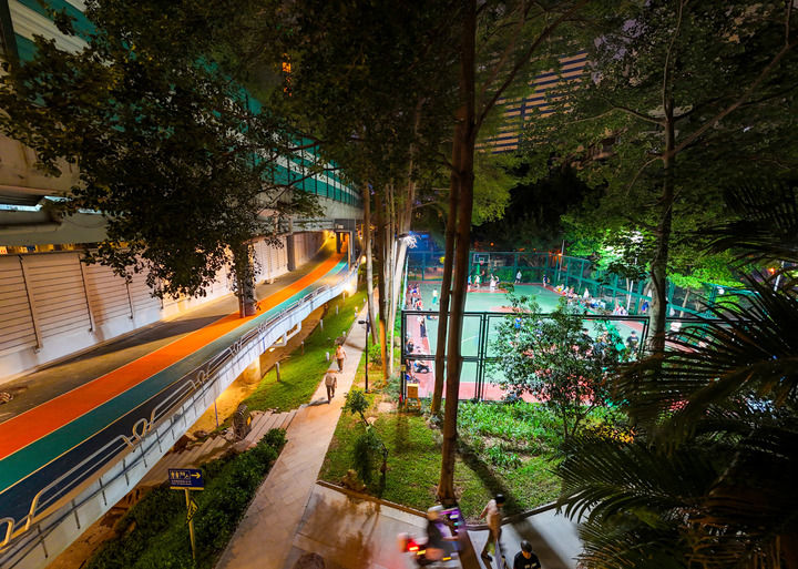 东濠涌高架边的慢跑道和“灯光球场”。