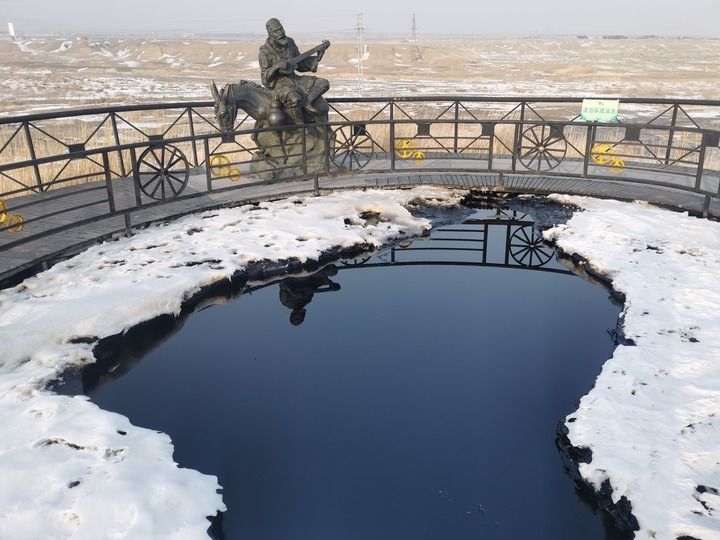 在镌刻着“黑油山”三个大字的花岗岩石碑旁,散布着油泉涌溢形成的“黑油池”。池面如镜,漆黑深邃,却又泛着柔和的光泽,仿佛一块被岁月打磨的墨玉,镶嵌在黄褐色的沙砾之间。微风拂过,油面轻轻荡漾,沉默与能量在此交织流淌,散发出独特而厚重的气息。