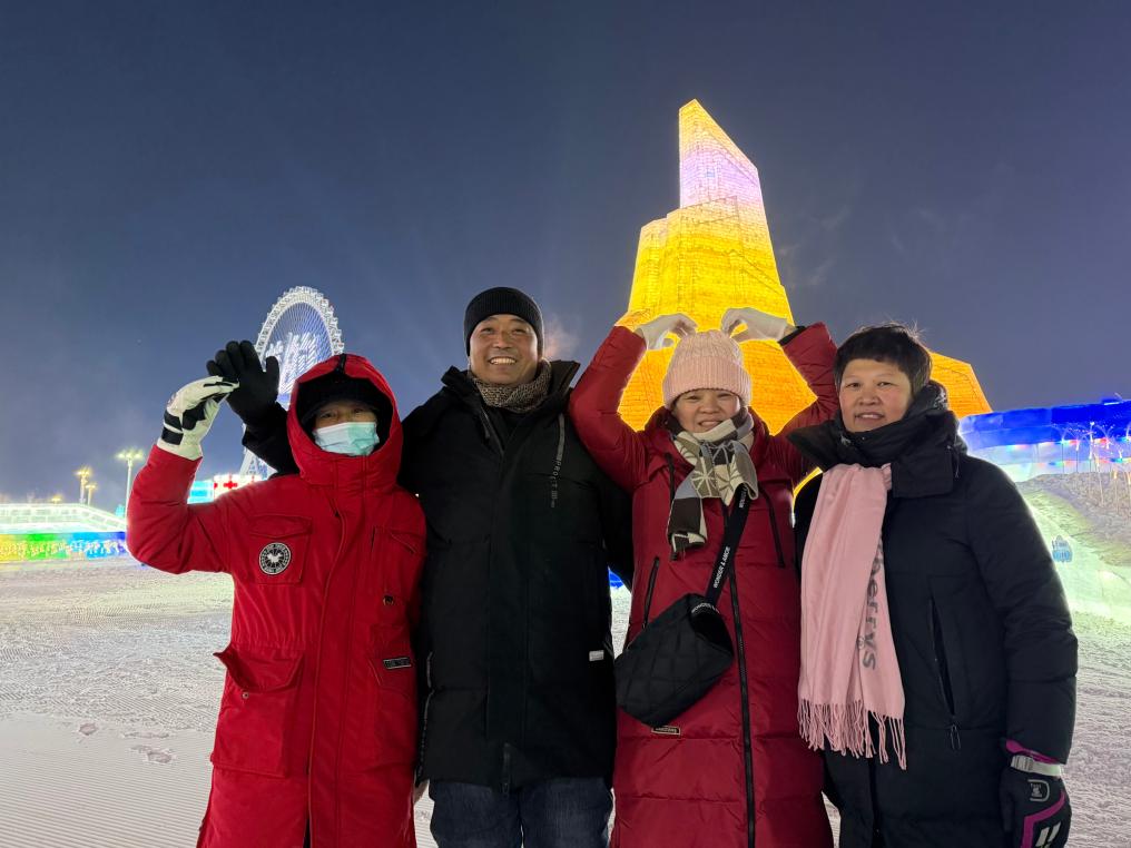 12月16日,衣凤龙(左二)和家人在哈尔滨冰雪大世界合影。新华社记者杨思琪 摄