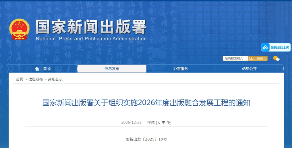 记者12月25日获悉,国家新闻出版署近日印发通知,组织实施2026年度出版融合发展工程。2026年度出版融合发展工程聚焦出版深度融合发展的关键环节,主要开展出版融合发展重点项目推介培育、优秀人才培养锻造、关键问题深化研究等工作,以重点项目、优秀人才、研究成果合力支撑出版深度融合发展。
