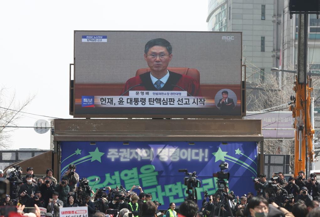 2025年4月4日,民众在韩国首都首尔的韩国宪法法院附近观看尹锡悦弹劾案宣判过程的电视直播。