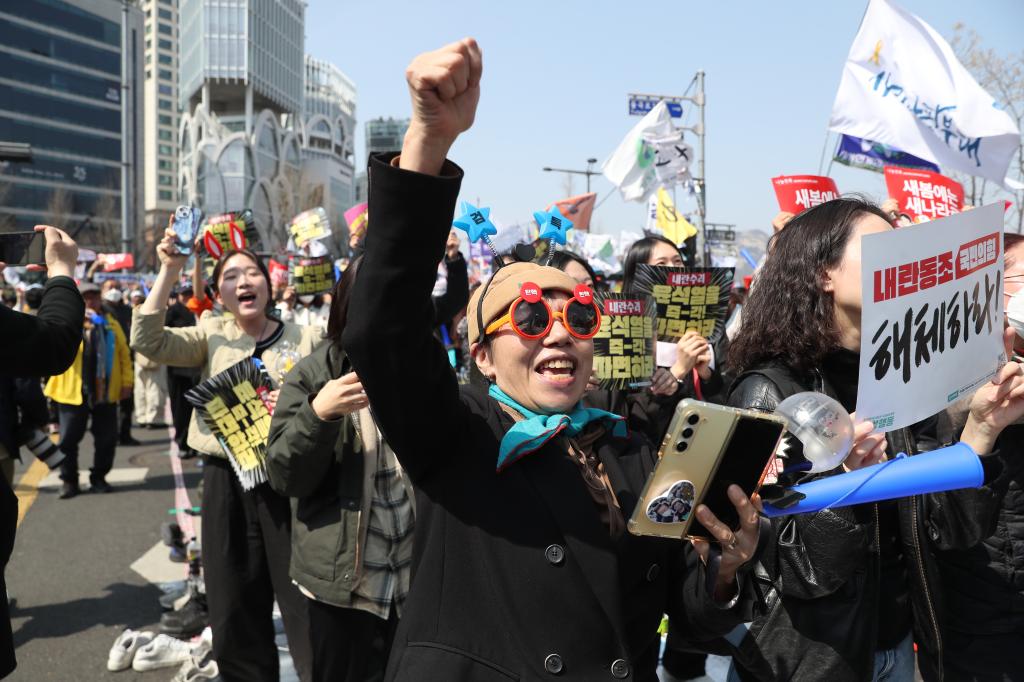 2025年4月4日,民众在韩国首都首尔的韩国宪法法院附近庆祝尹锡悦弹劾案获得通过。