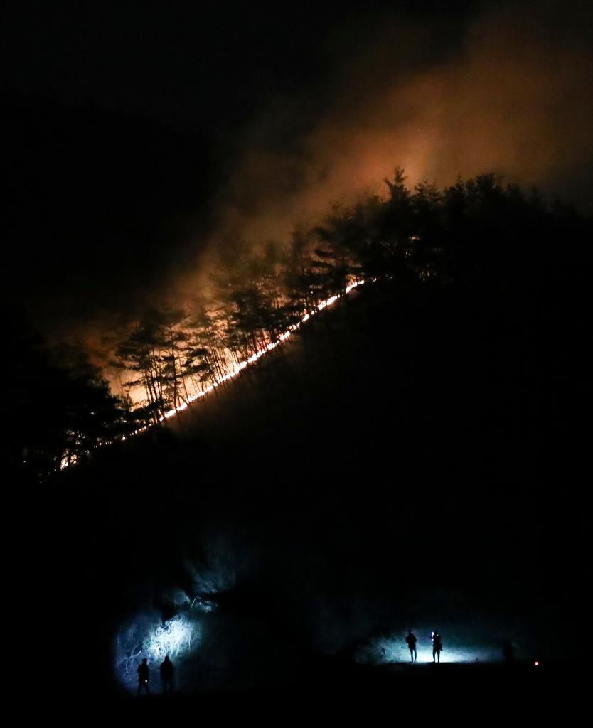 这是2025年3月27日晚拍摄的韩国庆尚北道青松郡山火现场。据韩国中央灾难安全对策本部27日21时通报,韩国多地森林火灾已造成28人死亡、32人受伤。
