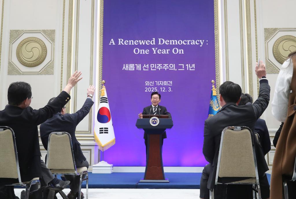 2025年12月3日,在韩国首都首尔青瓦台迎宾馆,韩国总统李在明举行外媒记者会。