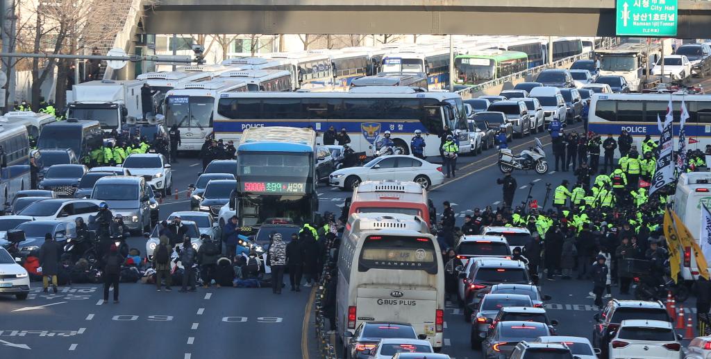 2025年1月15日,警察在位于韩国首尔的总统官邸附近维持秩序。
