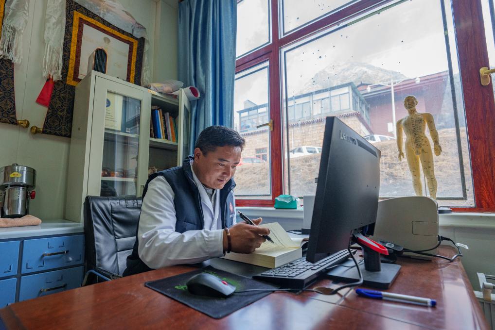 2月5日,玉麦乡卫生院副院长次旦米久在办公室研读藏医书籍。新华社记者 丁增尼达 摄