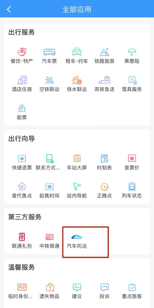 12306App上“全部应用”中的“汽车托运”服务入口。