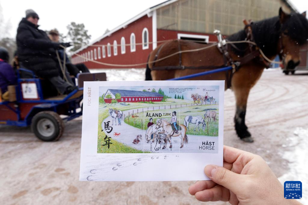 这是1月21日在芬兰奥兰群岛自治区首府玛丽港市附近一处马场拍摄的马年生肖主题邮票。新华社发(马蒂·马蒂凯宁摄)