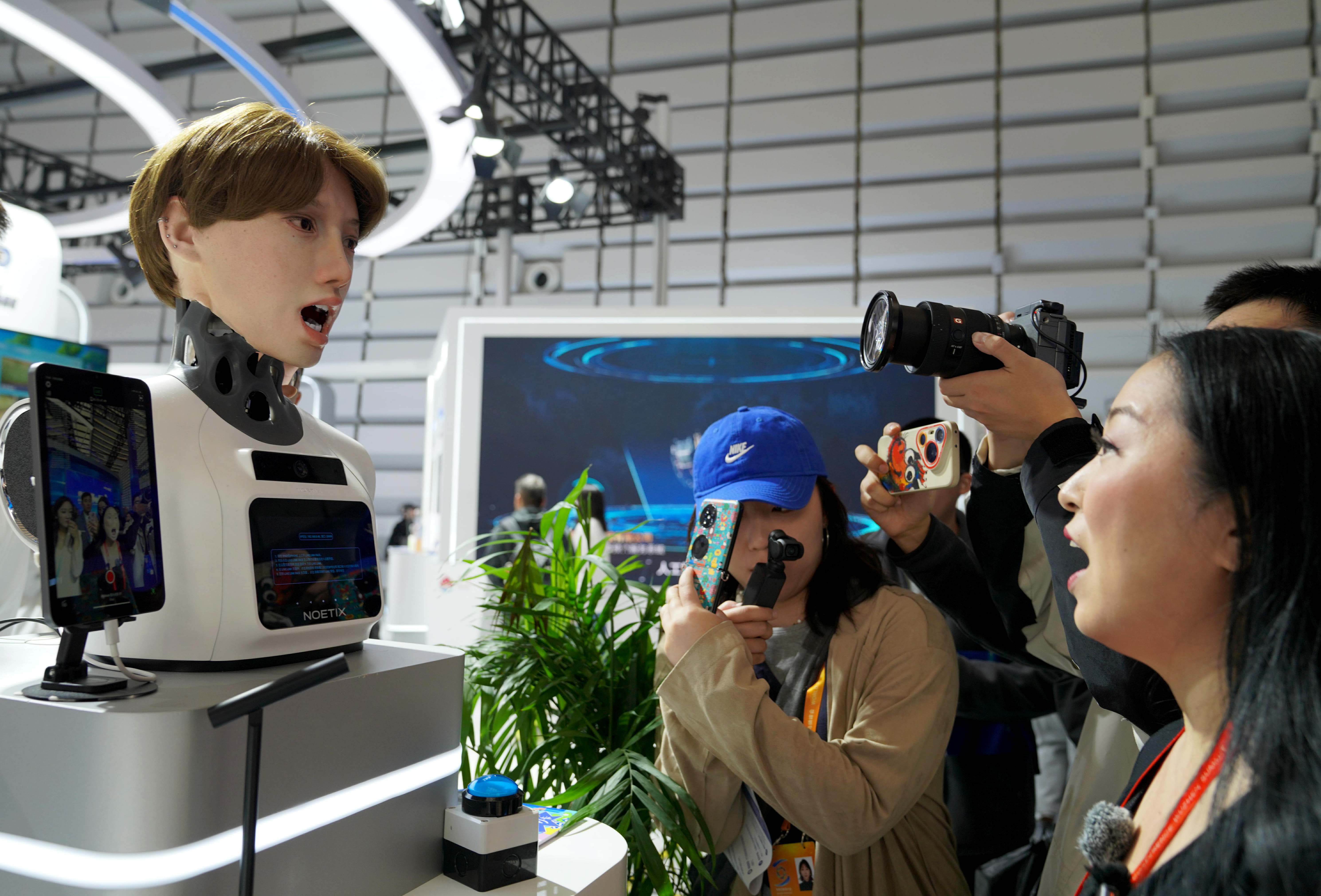 2025年11月6日,一名工作人员与一款松延动力仿生机器人互动。新华社记者 赵宇思 摄