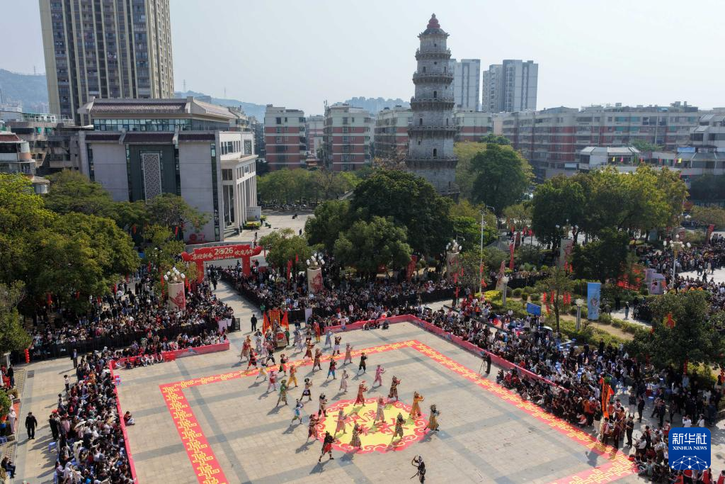 2月21日在广东汕头潮阳区拍摄的“2026年春节潮阳英歌嘉年华活动”(无人机照片)。