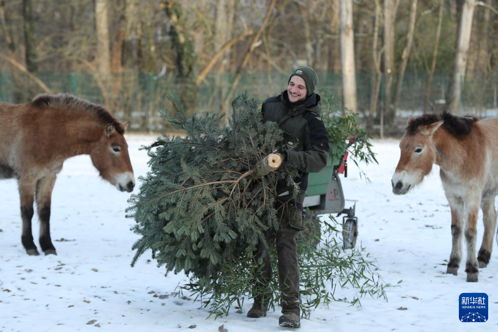 2月19日,在德国柏林动物公园,管理员诺曼·布罗齐奥为普氏野马准备饲料。