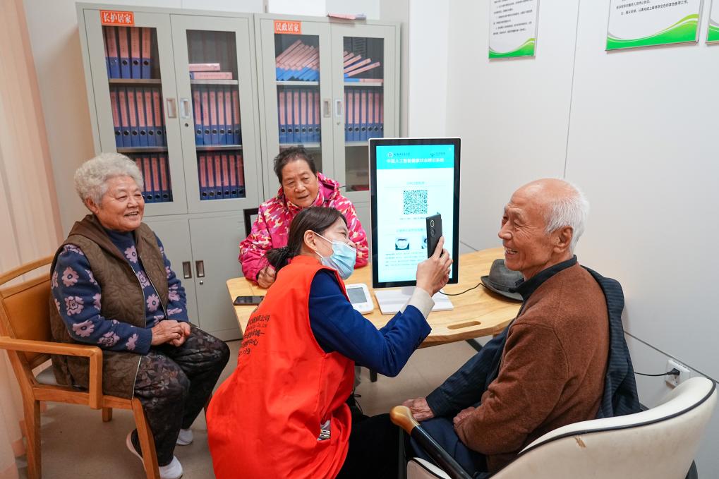 2025年10月23日,老人们在山东省淄博市张店区马尚街道金石社区日间护理中心测量健康数据。中国特色养老服务体系正加速构建,每年为65岁以上老年人提供约1.4亿人次健康管理服务。新华社记者 朱峥 摄
