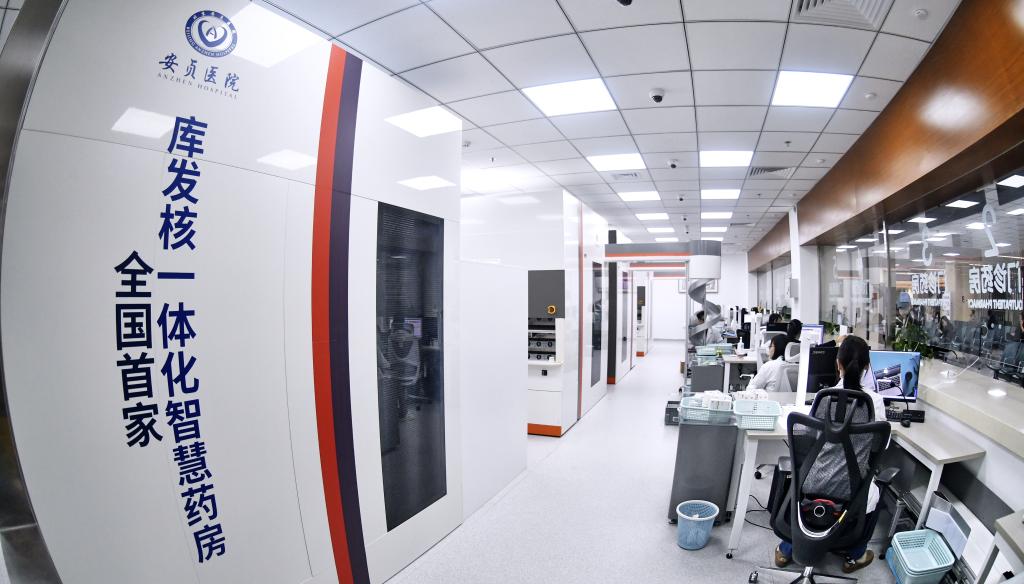 2026年2月3日拍摄的北京安贞医院通州院区库发核一体化智慧药房。该院作为北京市政府指定的首家“机器人+医疗”应用示范单位,已有25款医疗机器人在临床试用,覆盖了门诊、药房、病房、手术室、导管室等多个区域。新华社记者 李欣 摄