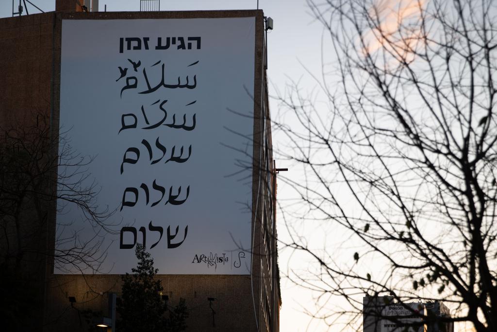 艺术家用画笔绘就从阿拉伯语“和平”到希伯来语“和平”的过渡变化,以此提醒人们共存的渴望以及彼此文化的相似。