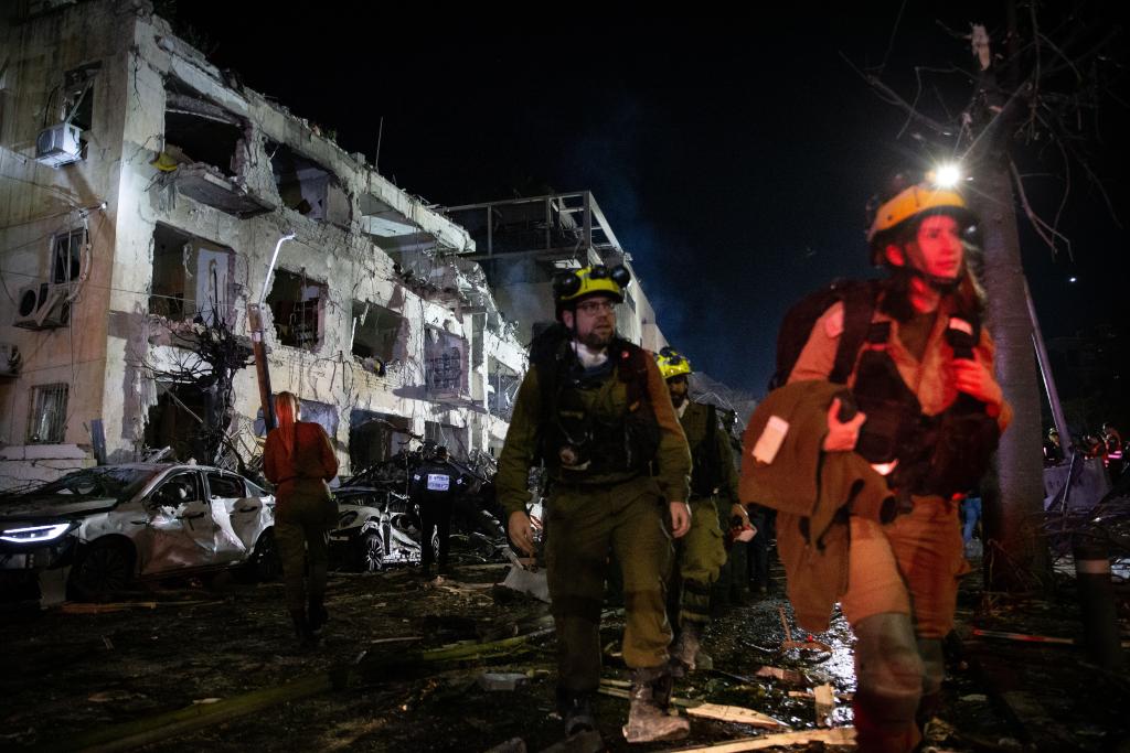 3月1日凌晨,以色列应急救援和安全机构人员在特拉维夫一处遭袭现场开展工作。