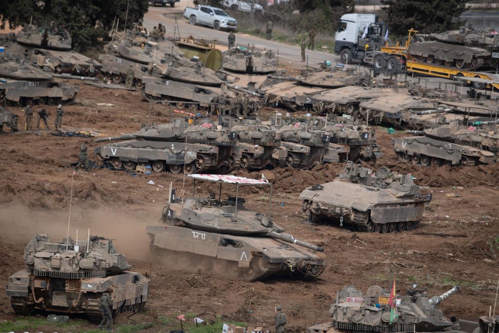 这是3月13日在以色列北部与黎巴嫩接壤的边境地区拍摄的集结的以军部队。